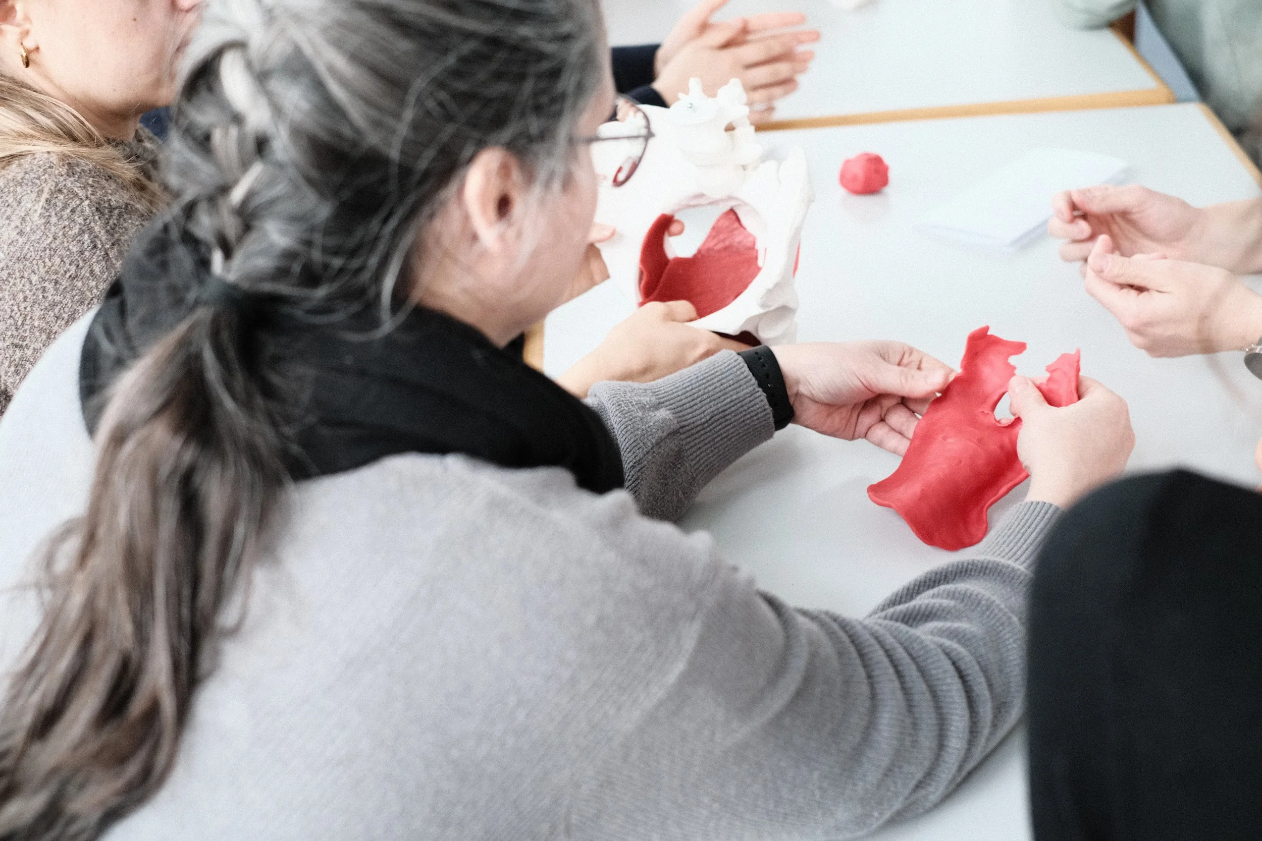 An den praktischen Fortbildungstagen üben wir die gezielte Untersuchung der Beckenbodenfunktion mit Palpation und Ultraschallanwendung. Spielerische Lernmethoden, wie das Nachbauen anatomischer Strukturen mit Knete oder das Erleben von Bewegungszusammenhängen im Modell, machen komplexe Inhalte greifbar und einprägsam.